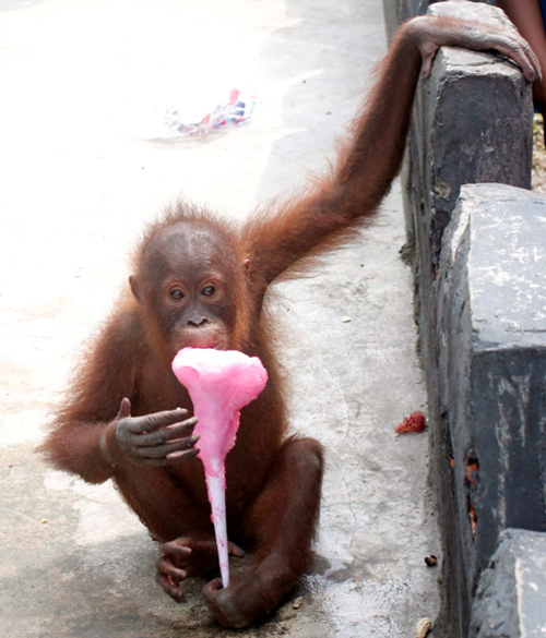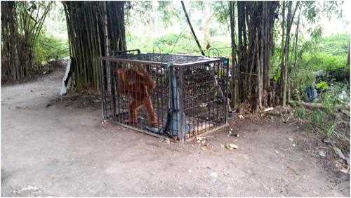 Supervision of orangutans at Kasang Kulim Zoo in Pekanbaru, Riau Province is very week. Visitors can make direct contacts with the orangutans.