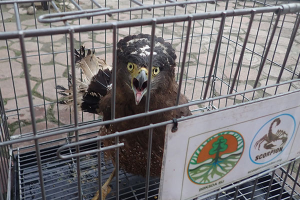 After finding the report, a joint team consisting of field staff from BBKSDA SU - SKW II and from the SCORPION Foundation visited Mr. Surya's place to investigate this case. The BBKSDA SU staffs confirmed that this bird is a protected species, should not be traded. Unfortunately, the team did not find the bird seller. Furthermore, Mr. Surya handed over the bird, a Crested serpent eagle, as evidence to the team. After making the submission report, in the evening, the team took the bird to Wildlife Rescue Center in Sibolangit for rehabilitation and will be released back into the wild when it is ready.