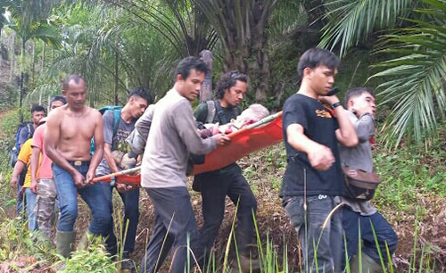 Vet doctor, Anhar Lubis being rescued from Huta Godang village. (Lensaterkini)