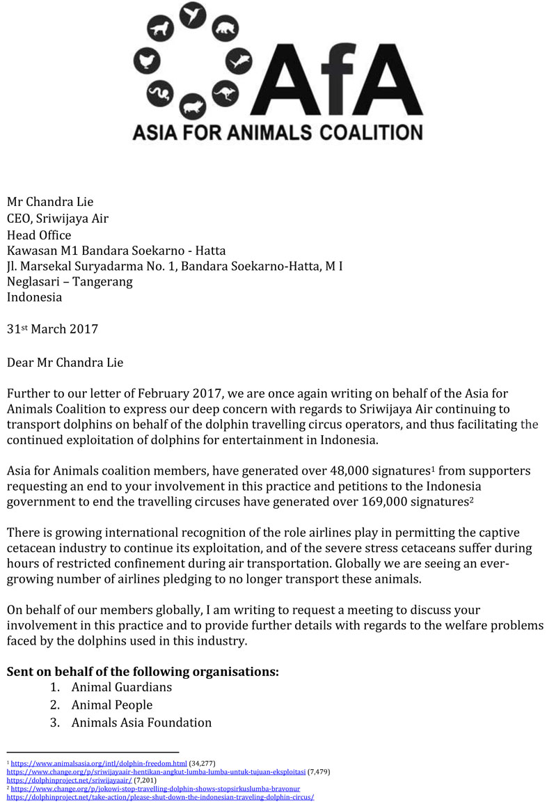 Animals Coalition (AfA) today (Friday, 31st of March 2017) sent another letter to