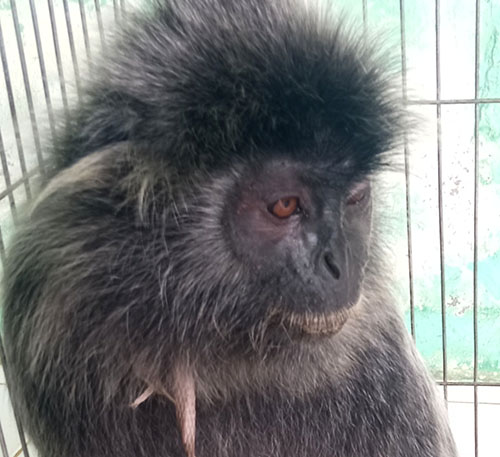 A silver langur or silvery lutung (Trachypithecus cristatus) was electrocuted in Tano Bato village, Padangsidimpuan, North Sumatra, causing him to fall down and unconscious. A resident of Tano Bato took the animal and put it in a cage next to his house. The villager was thought to be dying soon but fortunately the next day, it turned out that the animal was still alive.