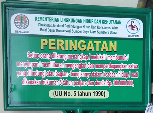 The signboards which are made by Scorpion contain a warning that anyone who captures, keeps, kills, trades, or transports protected animals will be sentenced to five years in prison with a fine of IDR100,000,000 (US$7,400.00).