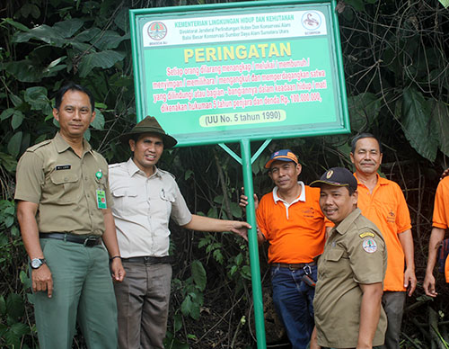 In an effort to prevent the capture and holding of protected animals, Scorpion and BBKSDA have put up signboards warning of the sentence and monetary fines associated with the capture and holding of protected wildlife. These signs were installed in conservation areas in the districts of Deli Serdang, Karo, and Dairi in North Sumatra on Tuesday (12th of December 2017). Up to 15 signboards were put up at the edges of conservation areas including in Sibolangit Nature Recreation Park, Siranggas, Sicike-cike, and Lau Debuk-debuk. Ten signboards were made by the BBKSDA while a further five were made by Scorpion Foundation.
