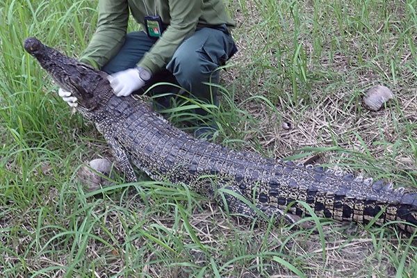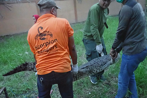 On November 6, 2020, a joint team from the wildlife authority (BBKSDA SU) and field staffs from the SCORPION Foundation conducted an evacuation of a Saltwater crocodile (Crocodylus porosus).