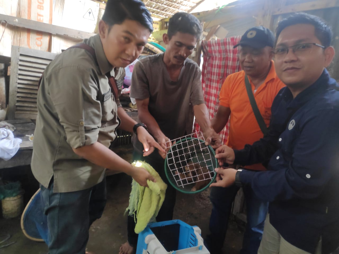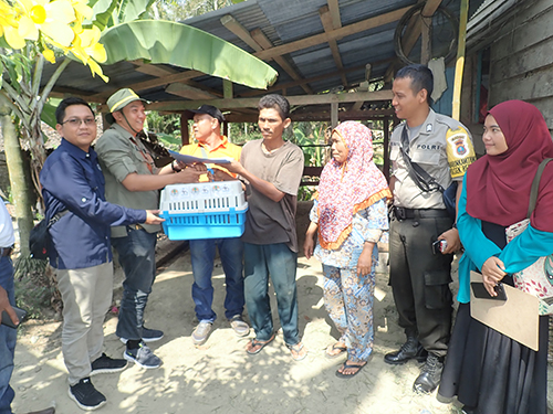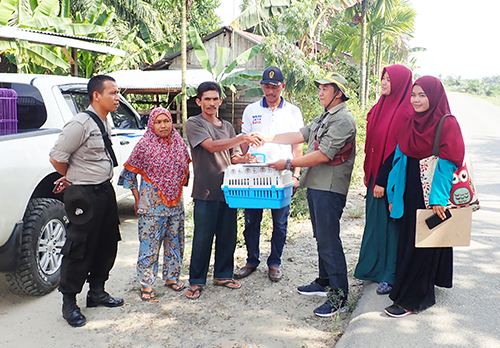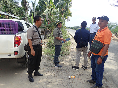 Hand over of the slow loris from the illegal owner to the BBKSDA-SU. Two students of Forestry Faculty of Syiah Kuala University, Senah Wati (no 1 from right) and Susanti (no 2 from right) also participated in the the rescue mission.