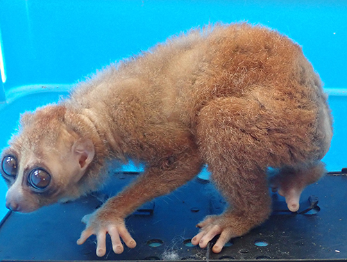 When we asked his comments about the condition of the slow loris from the picture, Director of Wildlife Preservation Foundation Frantisek Pribrsky MSc., said, "It is always difficult to say anything only from photo but judging by its condition, this animal is definitely suffering from severe malnutrition, and dehydration. This condition is caused by long time overall poor nutrition during the keeping of the animal in captivity.