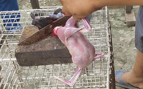 of the fruit bats. After the slaughtering, the trader immediately skinned them