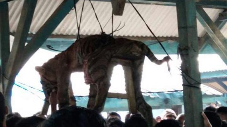 A Sumatra tiger is tied up and hanged in a house of a local community in Bangkelang Village, Batang Natal sub-district of Mandailing Natal Regency in North Sumatra province on Sunday (March 4, 2018). This poor Sumatran tiger was made a spectacle of the community.