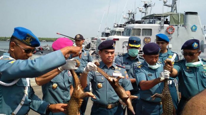 The Indonesian Navy members showing the pangolins which were scheduled to send to Malaysia on Tuesday, 13th of June 2017.
