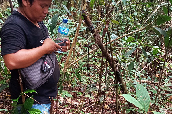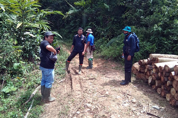 The patrol team is recording the findings of piles of wood that are suspected to be the result of illegal logging