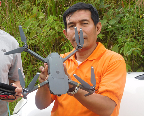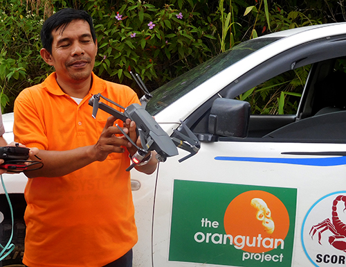 Head of the Tapanuli Orangutan Protection Unit (TOPU), Yasra Alfariza holding a drone a moment before it was flown to get aerial view of orangutan habitat in Batangtoru forest.
