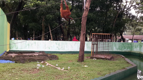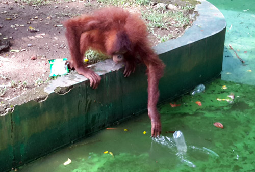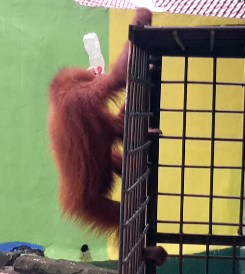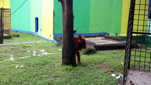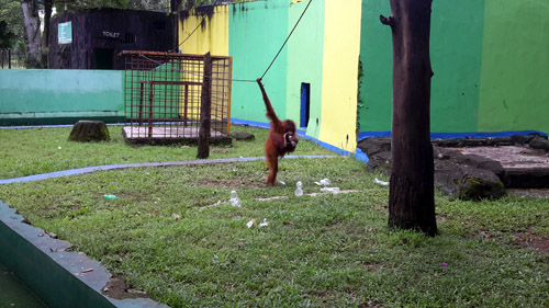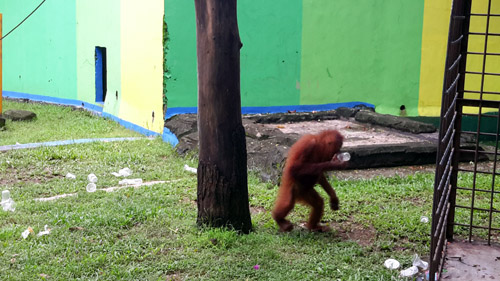 Plastic paper and plastic bottles/cups in the enclosure of orangutan in TRMS Serulingmas.