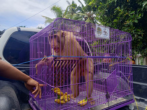 Preparation for transportation of this macaque from Tandam Hilir II to a temporary holding cage of the BBKSDA in Stabat, Langkat.