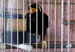 Nias parrot (Gracula religiosa robusta), protected by Government Regulation number 7/1999, on sale at wildlife shop in Simpang Peut, west coast of Aceh in Nagan Raya district.