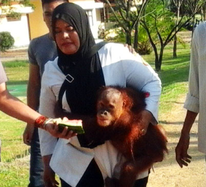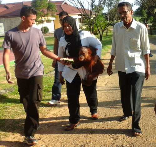 The orangutan, named Sule (4 years old), had been kept illegally by a family in Aceh Barat Daya district in Aceh. When the rescue team arrived in early June to confiscate Sule, the owner refused to hand him over, and took the primate away and hid him.