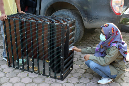 Loading the animals into a pick up car. Picture from left: Lucie Cismarova (a certified animal keeper from ISCP), and Gunung Gea from Scorpion Foundation. On the back row are Frantisek Fribiesky from ISCP, Safrit Batubarra and L. Sihombing (respectively from Leopard Brigade)