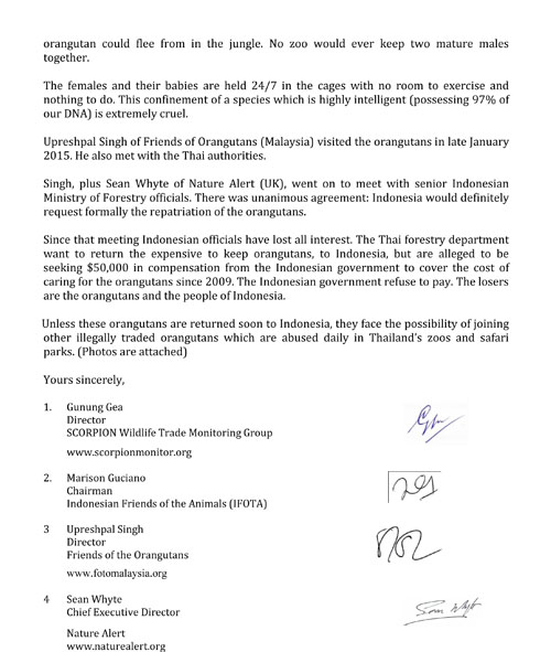 In July 2015, the Scorpion Foundation formed a coalition called “NGO Coalition for Repatriation of Orangutans from Thailand.” With Scorpion being its leader, the coalition members included the Indonesian Friends of the Animals (IFOTA), Friends of the Orangutans (FOTO) Malaysia, and Nature Alert (United Kingdom). After a long distance discussion among the coalition members about the conditions of the orangutans in Thailand, this NGO group decided to send a joint letter to the Minister of Environment and Forestry Mrs. Siti Nurbaya Bakar. The letter was finally sent on 27 July 2015 urging the Minister to repatriate the 14 orangutans from Thailand.