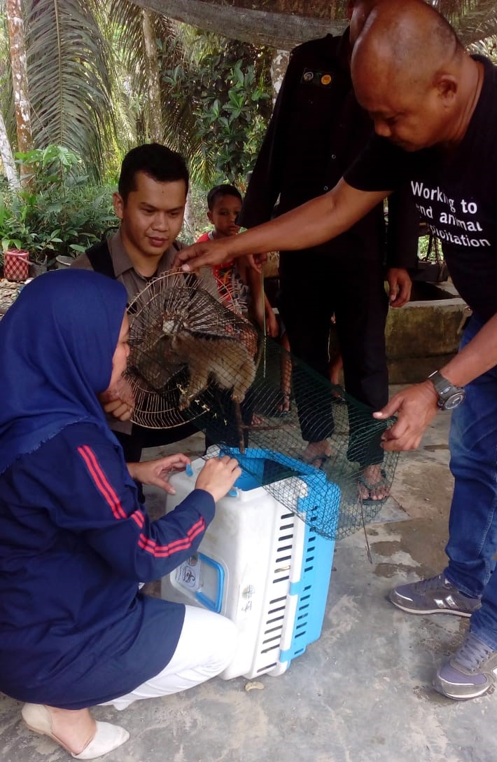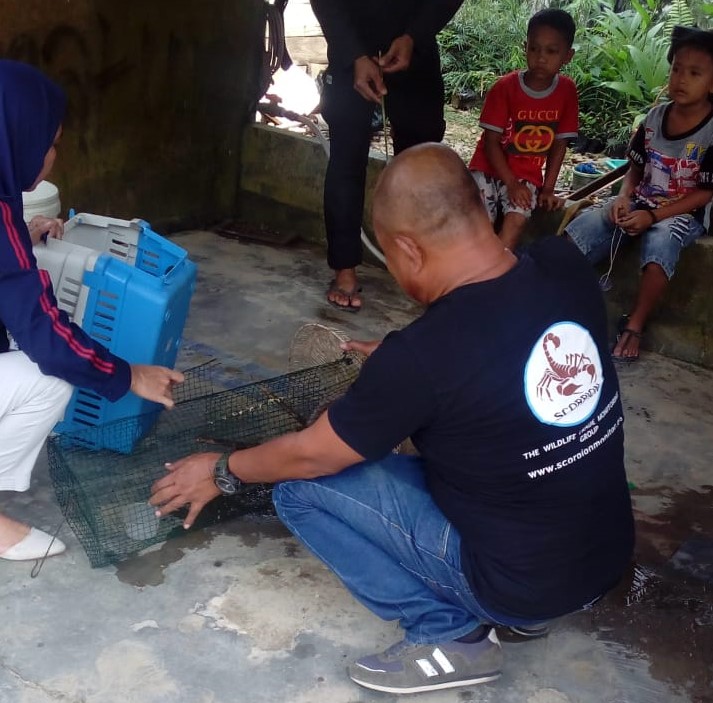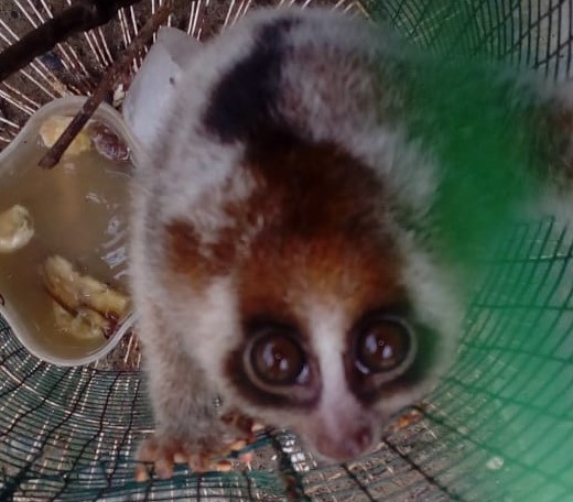 A team from the Wildlife Authority (BBKSDA) in North Sumatra and Scorpion Foundation rescued a slow loris (Nycticebus sp.) from an illegal owner in Halaban village, Besitang, Langkat, North Sumatra on Wednesday (2019.10.23). This animal was found by a local resident (Mr. M. Jamin) on his farm area in Halaban village, captured and kept it home.