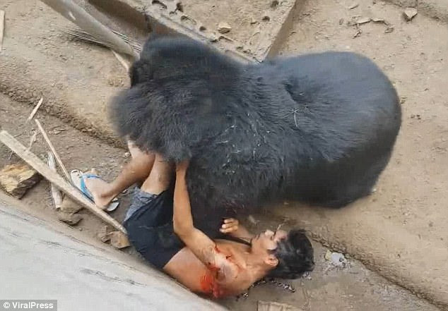 This is the horrifying moment a bear brutally mauls a tourist after he teased the beast by dangling food in its jaws.